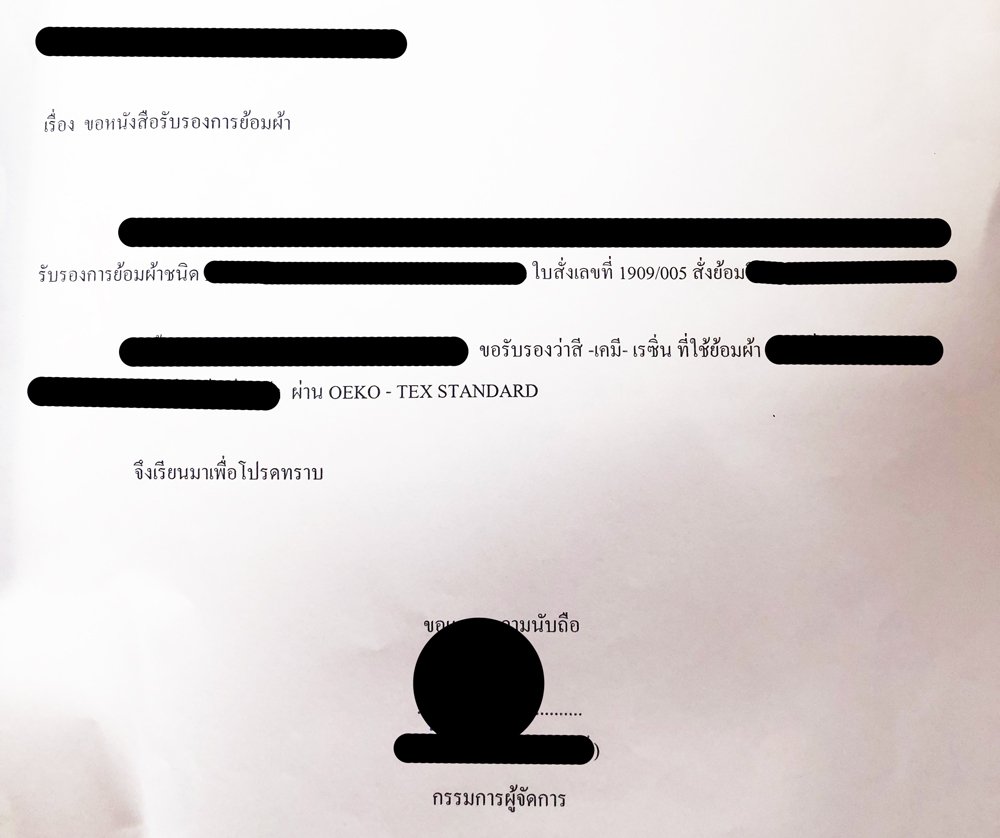 OEKO-TEX Standard สีย่อม-เคมี-เรซิ่น ไม่มีสารตกค้างก่อให้เกิดอันตราย** ในต่างประเทศค่อนข้างให้ความสำคัญสิ่งนี้ (ขออนุญาติปิดข้อมูลบางส่วนเป็นความลับทางการค้า)